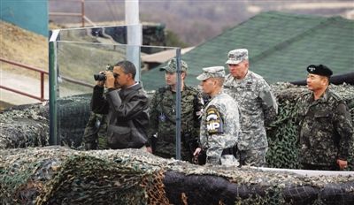 美國(guó)媒體分析稱,在美朝因?yàn)槌綔?zhǔn)備發(fā)射衛(wèi)星問(wèn)題關(guān)系緊張之際,奧巴馬造訪三八線,“毫無(wú)疑問(wèn)是為向朝鮮示威”。