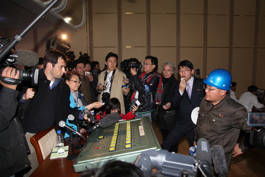 2012年4月8日,在朝鮮平安北道鐵山郡東昌里的“西海衛(wèi)星發(fā)射場”監(jiān)控中心,“西海衛(wèi)星發(fā)射場”總負責人張明進(戴藍盔者)向記者介紹情況。