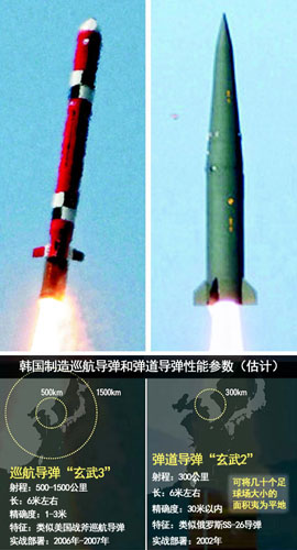 據(jù)韓國《朝鮮日報》20日報道,韓國19日首次對外公開了自制巡航導彈和彈道導彈。巡航導彈“玄武-3”最大射程1500公里,可精確打擊朝鮮全境核與導彈基地等主要戰(zhàn)略設施;彈道導彈“玄武-2”射程300公里,一發(fā)可將幾十個足球場大的面積夷為平地。