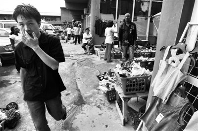 2002年,一名中國男子從尼日利亞拉各斯中國城的布店走出來。
