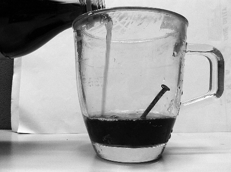 昨天中午12點(diǎn),記者針對(duì)微博上熱炒的“可樂去銹”事件,買來某品牌500毫升可樂一瓶,隨后將兩枚4厘米長銹跡斑斑的鐵釘放入透明的6厘米高的玻璃杯子里,開始做浸泡實(shí)驗(yàn)。