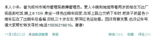 前天23時(shí)25分,一位微博名叫“勤行者有志”的網(wǎng)友發(fā)布了一條微博,稱(chēng)自己是“小朱”,曾為鄭州市城市管理局微博管理員,妻姐把一輛藍(lán)色的嬰兒推車(chē)落在了出租車(chē)后備廂,希望大家?guī)兔ふ摇?/p>