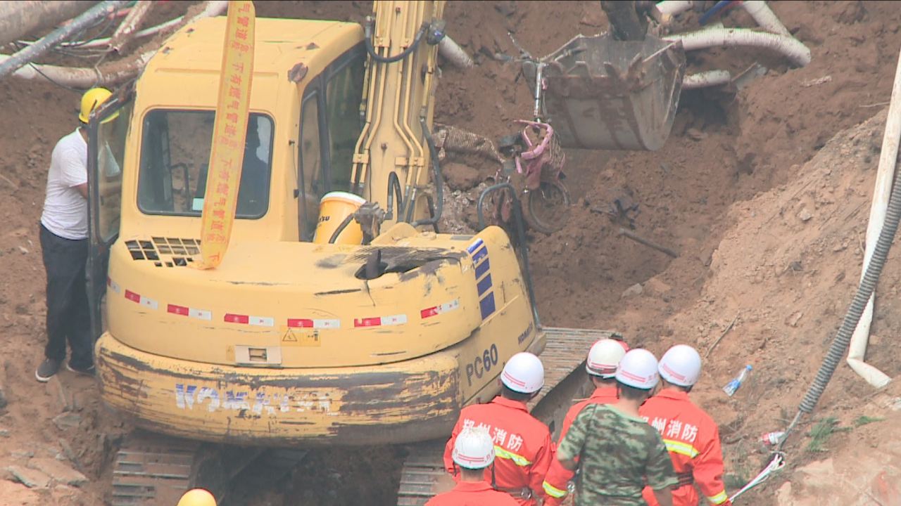中原路塌方現(xiàn)場再現(xiàn)險情 現(xiàn)場挖出電動車
