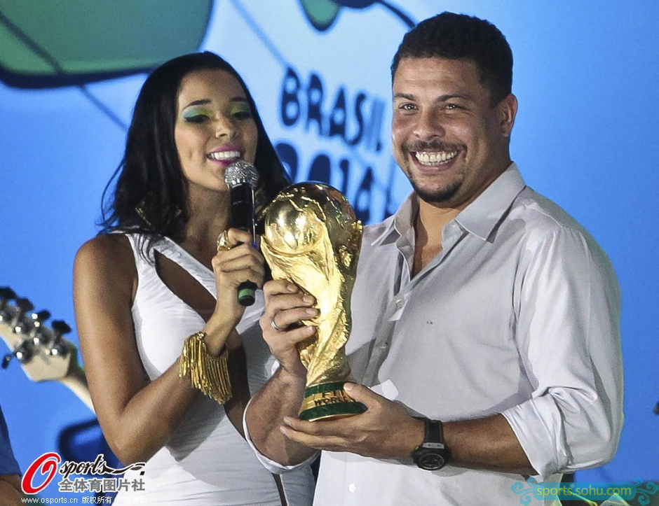 2014年世界球迷盛會(huì)上羅納爾多展示大力神杯,他曾在1994年和2002年兩度帶領(lǐng)巴西隊(duì)獲得大力神杯。圖為羅納爾多展示大力神杯。
