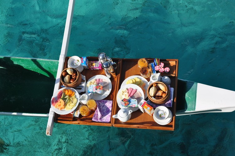 住在島上的水木屋里,睜開眼睛的時候,會有一對當(dāng)?shù)氐目∧忻琅瑒澲凰要毮局?,送上濃香的咖啡,配上吐司和各色水果。?dāng)然這頓早餐價格不菲哦!