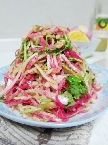取一個(gè)綠皮水果蘿卜,去皮,切絲,加入少許調(diào)料,拌勻即可,做法簡(jiǎn)單,味道不錯(cuò)。在調(diào)料上,加入少許橙汁或檸檬汁,讓蘿卜入口后口感更豐富而有層次,有著淡淡的橙子香氣。