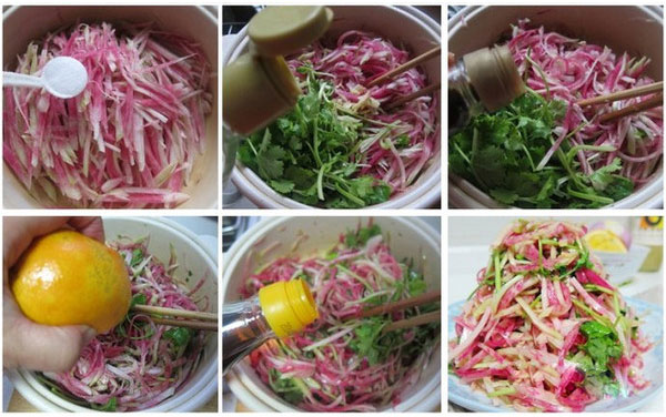 食材:水果蘿卜一個(gè),香菜幾棵,橙子半個(gè)(取汁),白醋、調(diào)汁魚露、麻油、鹽等少許。
