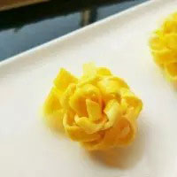 1. 雞蛋打散加少許鹽,淀粉加少許水調(diào)勻,加在蛋液中攪拌均勻,平底鍋小火,倒入蛋液,煎成薄薄的蛋皮,切成寬約4厘米的長(zhǎng)條。