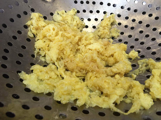 你知道名菜桂花廣肚中的桂花是怎么制作出來的嗎?就是圖中的操作,炸蛋液!這樣出來的雞蛋金黃色一絲絲的很像八月的桂花??墒抢畲髱煹摹肮鸹ā辈⒉皇桥c廣肚搭配,它要搭配的是---手撕大白菜!