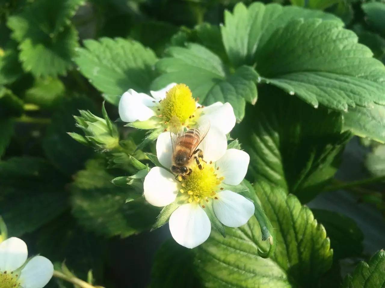 紅顏草莓是由優(yōu)質(zhì)草莓品種章姬和幸香雜交育成,它繼承了章姬的鮮甜和幸香的耐儲(chǔ)存,也因根基部顏色發(fā)紅得名。一進(jìn)棚,就聽到陣陣的嗡嗡聲。潔白的草莓花上,小蜜蜂展著透明的翅膀正忙著采蜜。據(jù)說經(jīng)過蜜蜂授粉良好的花朵才能長(zhǎng)出個(gè)頭飽滿勻稱的草莓。