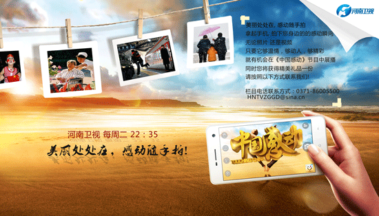 生活中某些情景在瞬間即能帶來感動(dòng),它適于簡(jiǎn)潔有力地表現(xiàn)。感動(dòng)隨手拍邀請(qǐng)您遇到生活的感動(dòng)瞬間,或樂于助人,或見義勇為,或甘于奉獻(xiàn),甚至只是讓你有所觸動(dòng)的溫情瞬間,請(qǐng)隨手拍下照片或者視頻。河南衛(wèi)視《中國(guó)感動(dòng)》欄目將在結(jié)尾以集錦的形式播出。一旦被節(jié)目選上 登上節(jié)目播出就會(huì)有獲獎(jiǎng)資格。