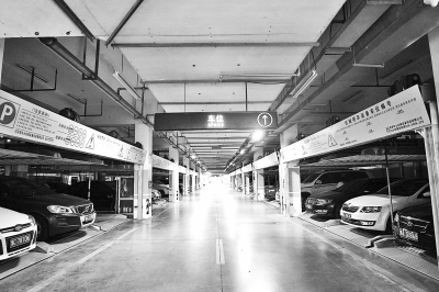 該停車場負(fù)一層是機械車庫,停得滿滿當(dāng)當(dāng);負(fù)二層也是機械車庫,但還有空位。