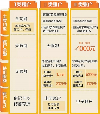 簡單說,Ⅰ類賬戶是全功能賬戶,常見的借記卡就屬于Ⅰ類賬戶;Ⅱ、Ⅲ類賬戶則是虛擬的電子賬戶,是在已有Ⅰ類賬戶基礎上增設的兩類功能逐級遞減,資金風險也逐級遞減的賬戶。主要區(qū)別如下表: