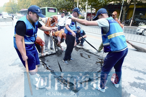 臺風(fēng)“天鴿”讓鄭州下了幾天的雨,許多道路積水塌方車輛陷進(jìn)去。中央氣象臺預(yù)報臺風(fēng)“帕卡”已經(jīng)登陸南方,受其影響鄭州又將面臨幾天的降雨,道路養(yǎng)護(hù)工們要趕在降雨前修復(fù)路面坑槽,預(yù)防各種危害的發(fā)生。