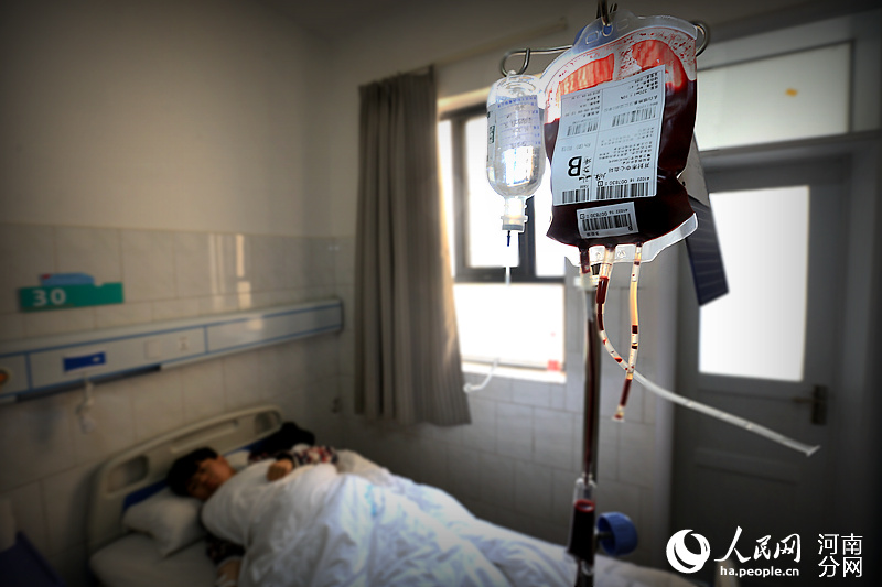 5月3日,記者來到河南省尉氏縣人民醫(yī)院的2樓。病房內(nèi),孫發(fā)青的兒子孫亞琦戴著口罩,雙眼無神的看著頭頂?shù)奶旎ò?,稚嫩的雙手由于連續(xù)的輸血而顯得有些臃腫,強(qiáng)烈的陽光透過窗戶直射在雪白的床單上。